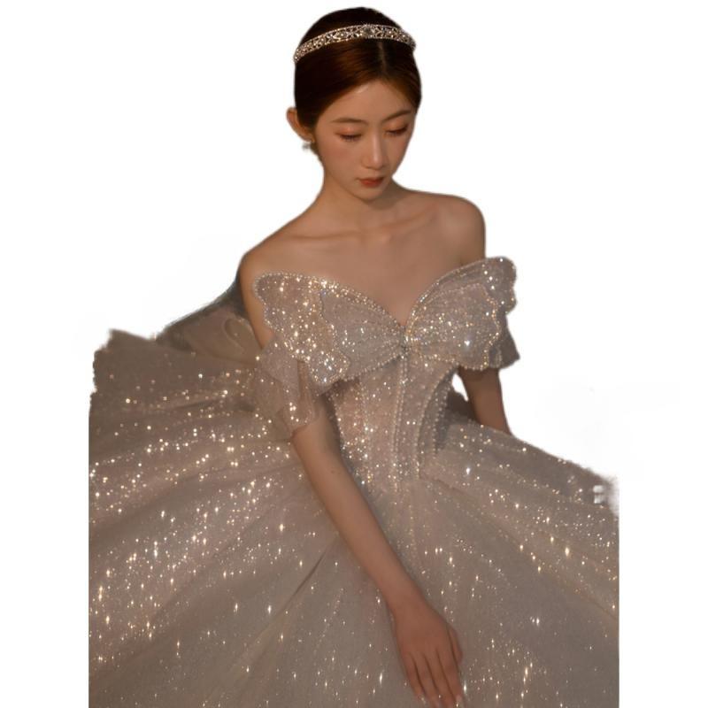 Luxuriöses Schulter-Hochzeitskleid mit großem Schmetterling Neues Brautkleid Perlenbesetztes Glitzerkleid