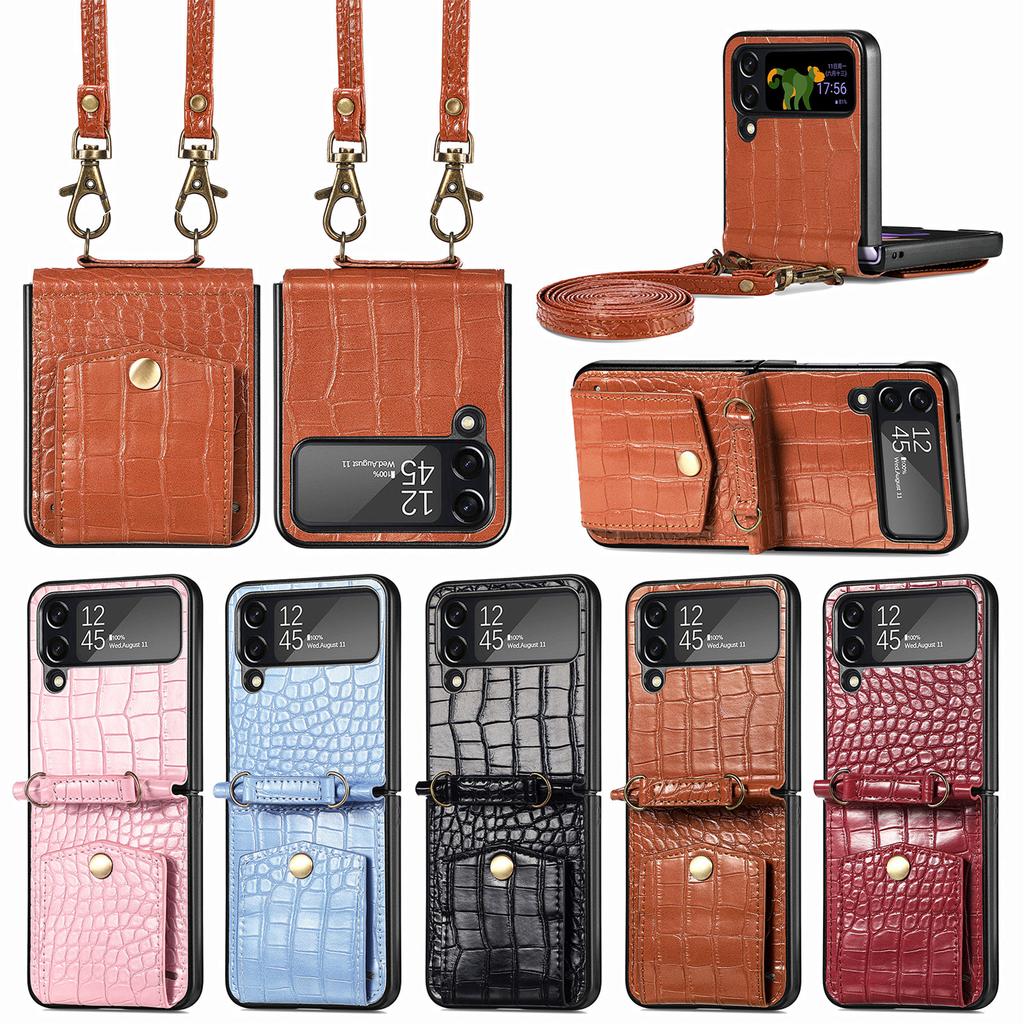 Cards Solt Leder-Crossbody-Lanyard-Hülle für Samsung Galaxy Z Flip 4 5G Flip4, Krokodilmuster, Standfunktion, Brieftaschen-Rückseite
