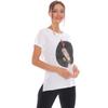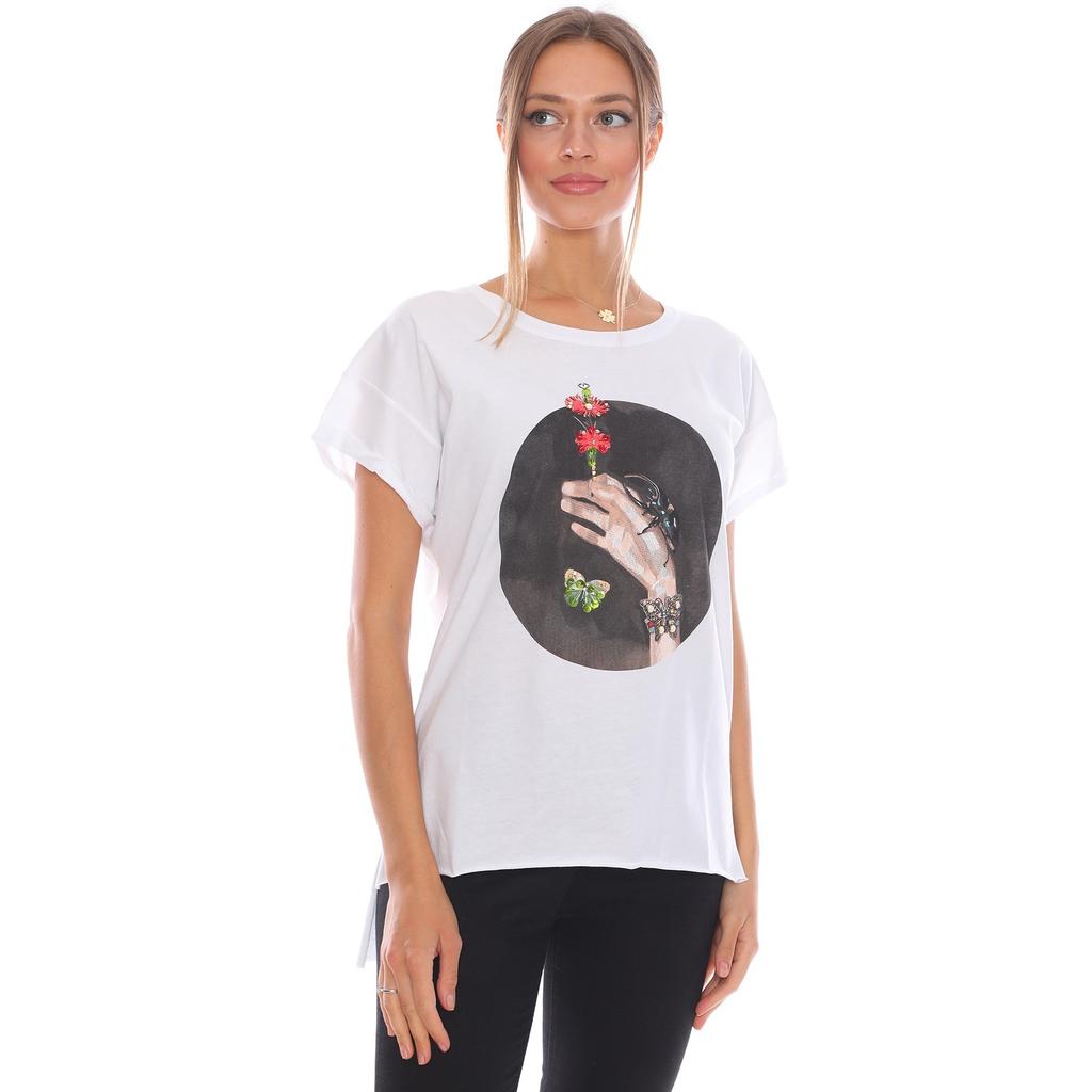Weißes, lockeres Damen-T-Shirt mit Blumenstickerei und Bilddruck