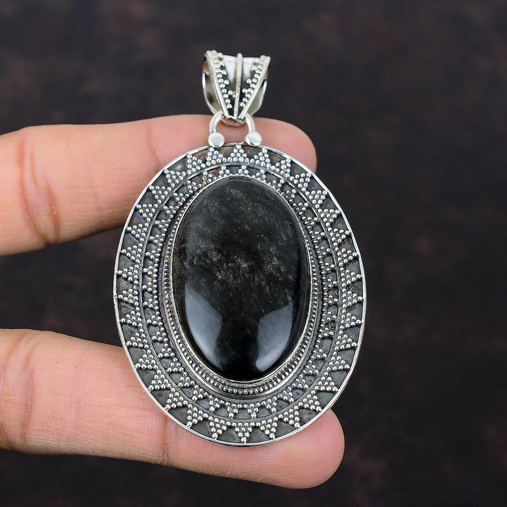 Silber glänzender Obsidian-Anhänger, echter Edelstein-Schmuck, 925er Sterlingsilber-Anhänger, handgefertigter Vintage-Anhänger, Geschenk für Frau, Boho-Stil-Schmuck
