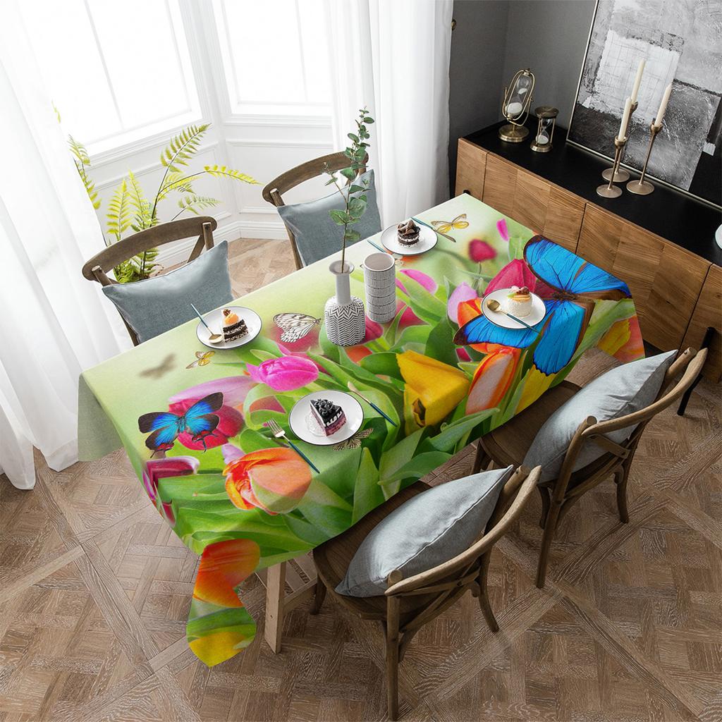 Tischdecke mit Schmetterlings-, Grün- und Blumenmotiv, Urlaubsdeko, wasserdicht, rechteckige Tischdecken, Hochzeitsdeko, Tischdecke