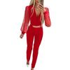 Damen-Overall mit Rosen-Applikation, durchsichtiges Mesh-Kettendekor, schmale Passform, V-Ausschnitt, hohe Taille, einfarbig