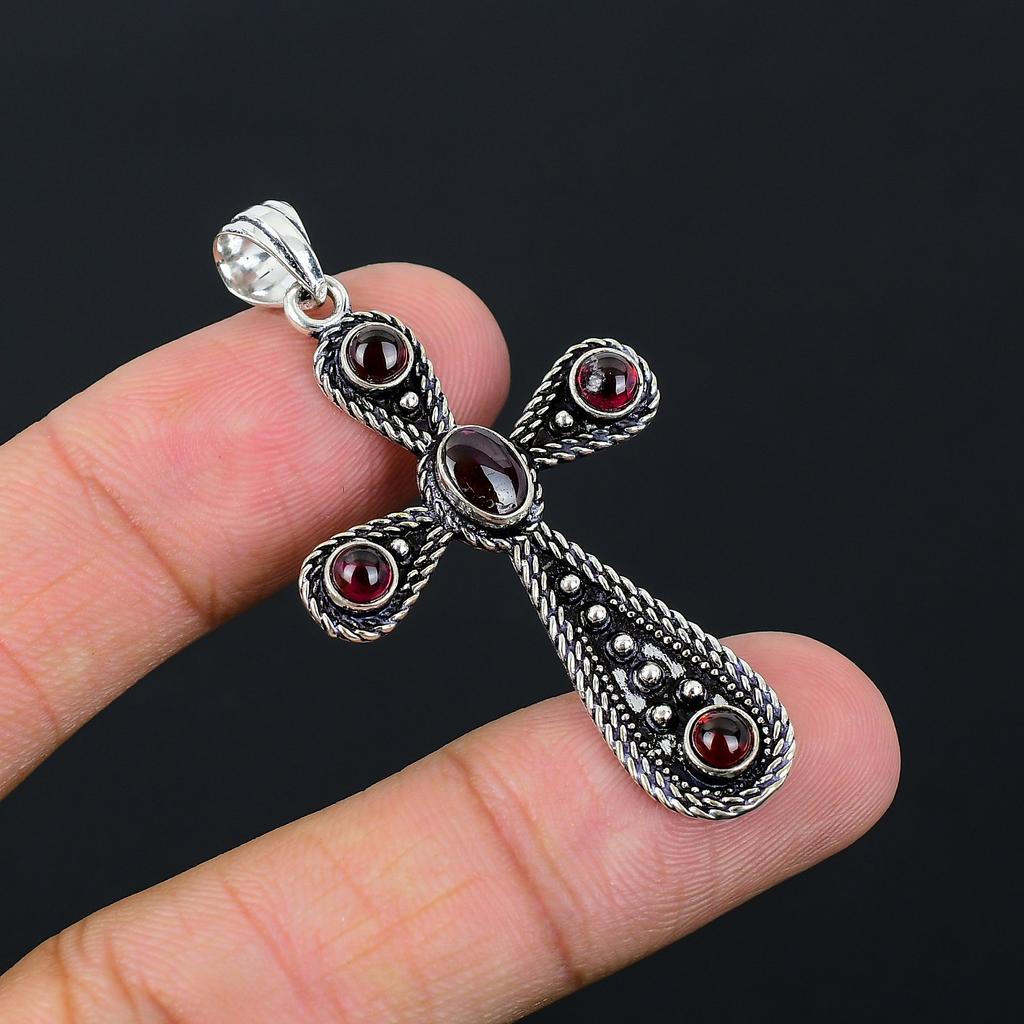 Natürlicher Granat Edelstein Handgefertigter 925 Sterling Silber Kreuz Anhänger 2,10" d3I87