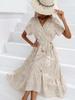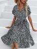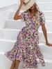 Damen Casual Floral V-Ausschnitt Kurzarm Hohe Taille Krawatte Chiffon Print Langes Kleid