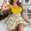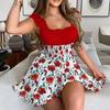 Damen Kleid Sommer Quadratischer Kragen Lässig Sexy Minikleid Damen Blumendruck Patchwork A-Linie Party Boho Kleid