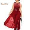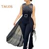 Damen Jumpsuit mit Strass-Schnallendekor, Mesh-Patchwork, plissiert, hohe Taille, ärmellos, reine Farbe, für formelle Anlässe, Party, Abschlussball