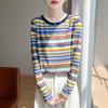 Regenbogen-Streifen, quadratischer Ausschnitt, gerade Schulter, stricken, langärmeliges Damen-Herbst- und Winter-dünnes, kurzes Oberteil im süßen Stil