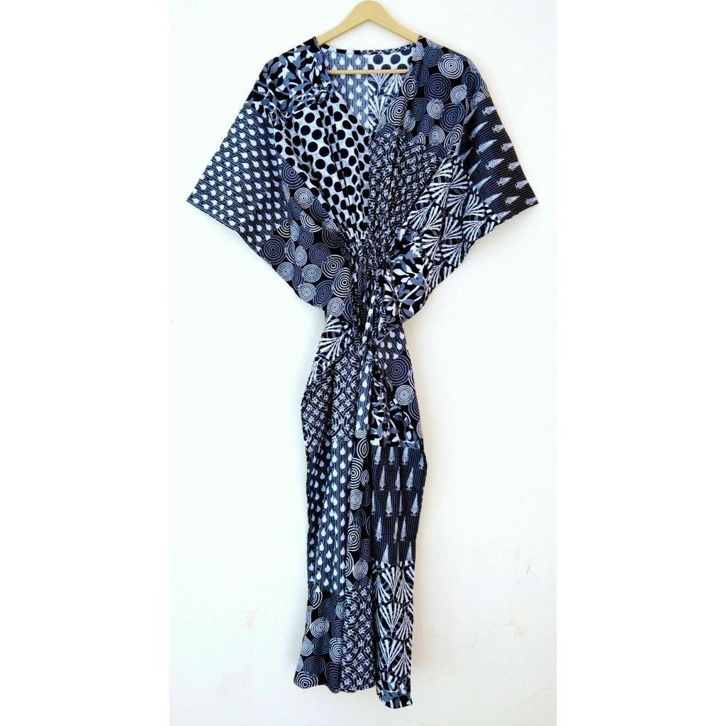 Indisches Schwarzes Langes Indigo-Print Baumwoll-Übergröße Maxi Damen Cover-up Kaftan Kleid CKFTN-SCRN-FULL-BUYIT-063