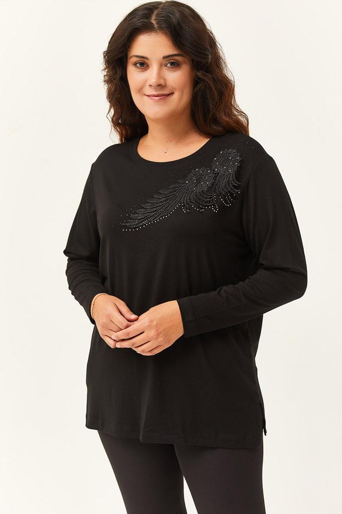Damen Übergröße Bluse Große Größe Vordere Blattstickerei Guipure-Detail Schwarze Bluse