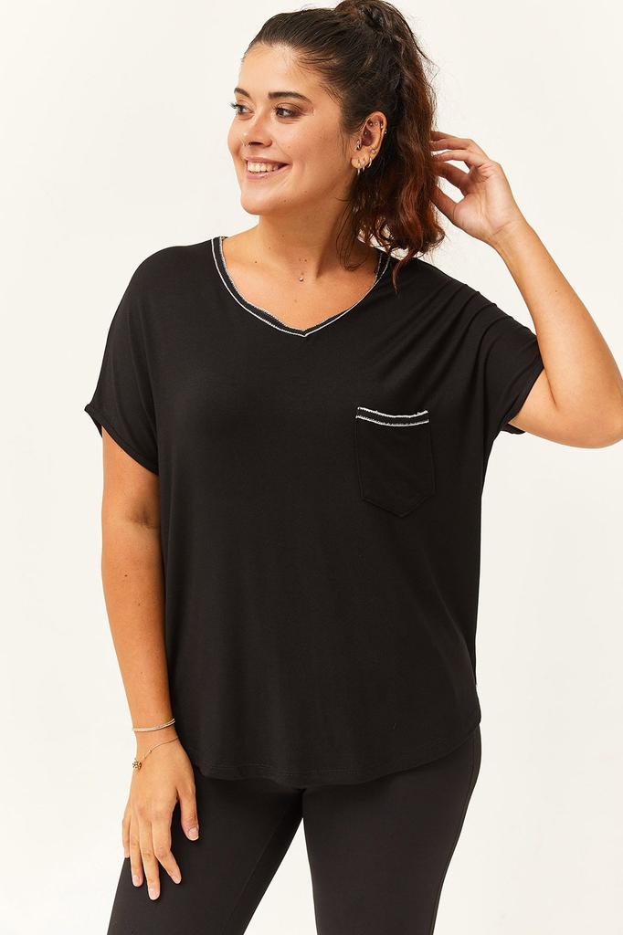Damen Bluse in Übergröße V-Ausschnitt Schwarze Bluse mit silbernen Streifen an Kragen und Taschen