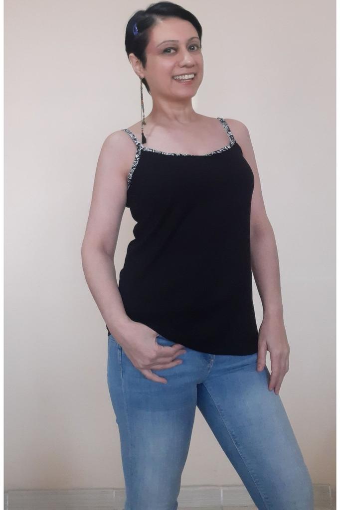 Damen Style Übergröße T-Shirt Schwarz Gekämmte Baumwolle Viskose T-Shirt Mit Floralem Paspeldetail Und Spaghetti-Träger