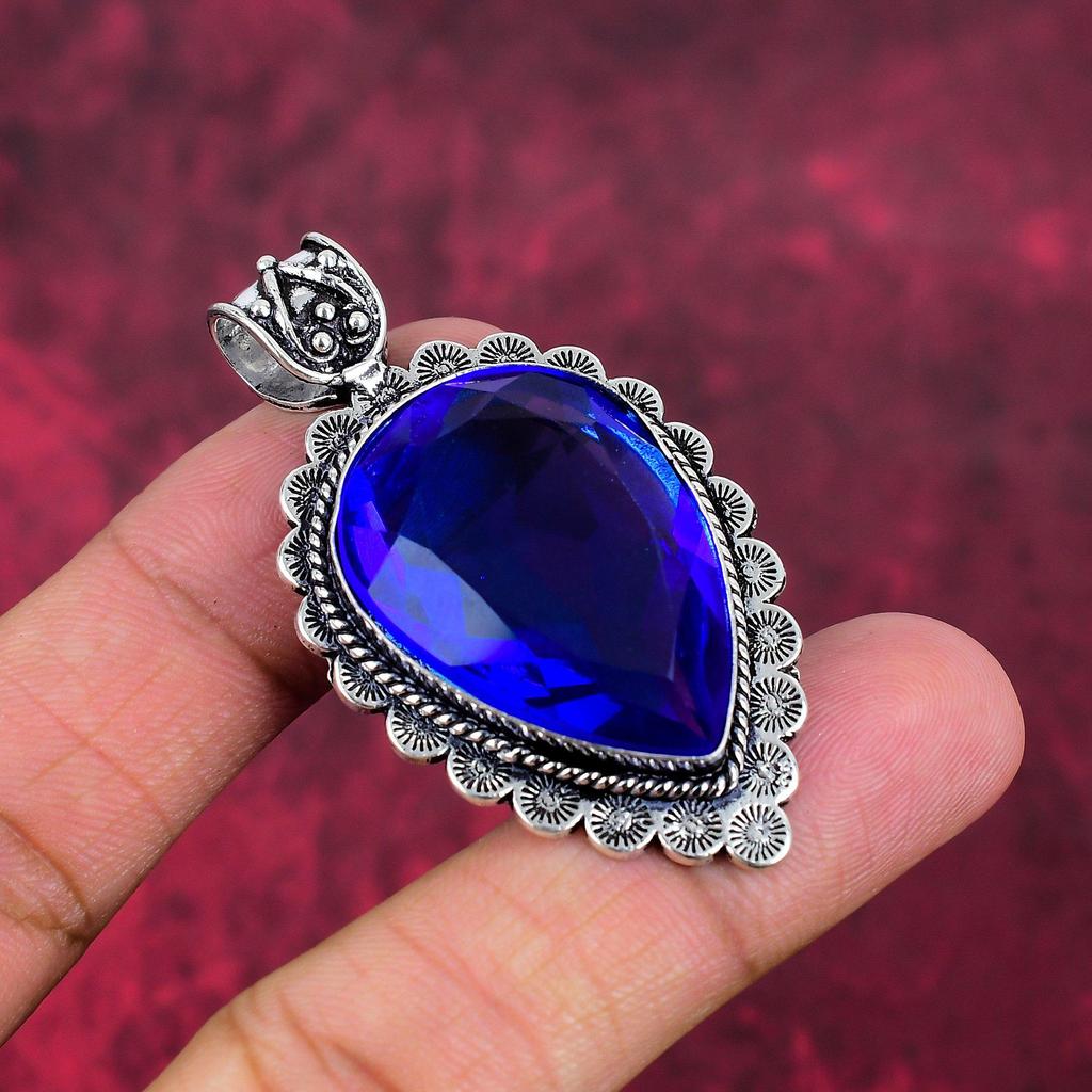 Blauer Saphir Anhänger, handgefertigter Edelstein Anhänger, 925 Sterling Silber Anhänger Antiker Schmuck, Verlobungsgeschenk