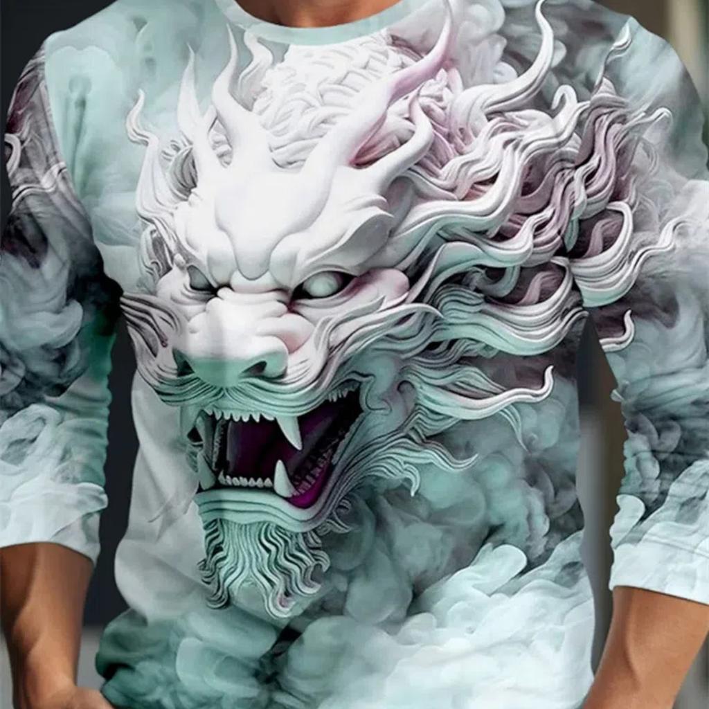 Frühling und Herbst Herren T-Shirt mit 3D-Digitaldruck und Drachenmuster, langärmelig, Rundhalsausschnitt, lässige Herren-T-Shirts, verwaschene Grafik-T-Shirts