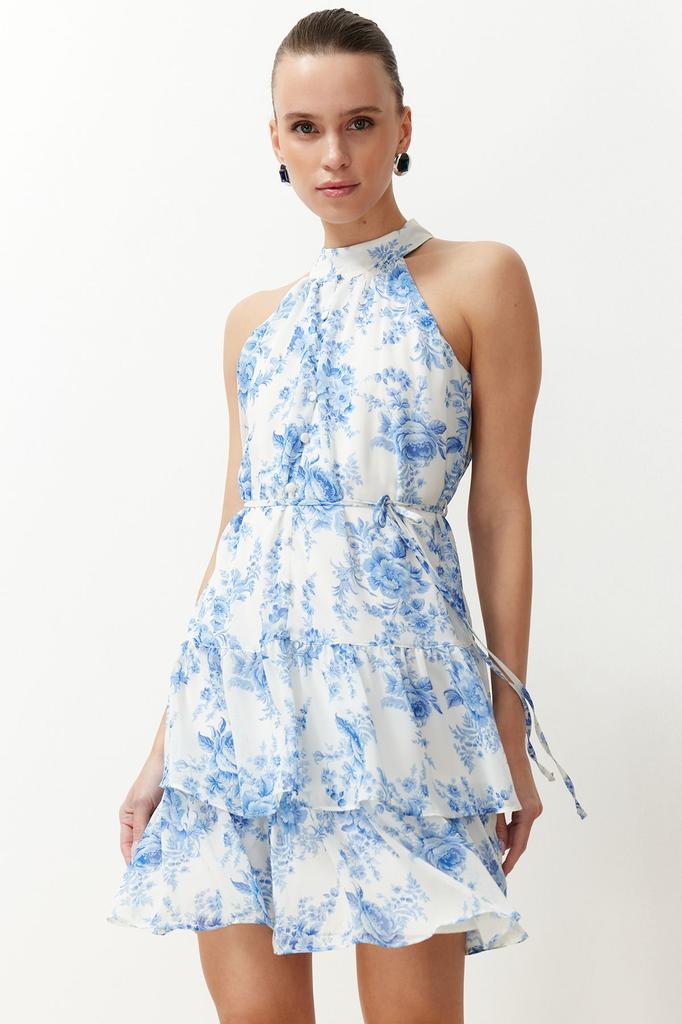Women's Fashion Ecru Floral Patterned A-Line Layered Mini Lined Chiffon Woven Dress