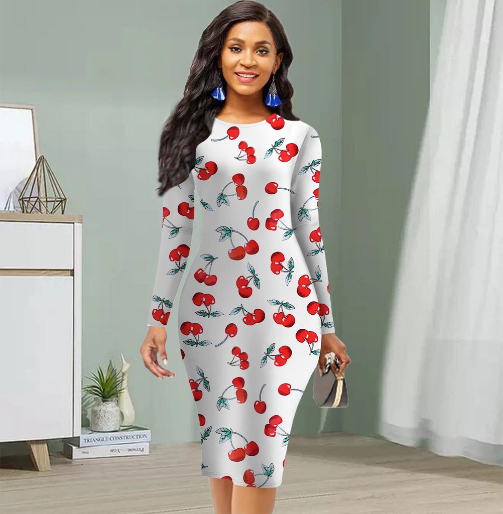 Long Sleeve Waist Tight Office Slim Fit Cherry Printing Elegant Bodycon Dress