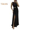 Abendkleid für Damen, plissiert, Schlitzsaum, bodenlang, einfarbig, Strass-Dekor, ärmellos, Rundhalsausschnitt, hohe Taille, Strass-Dekor, Abschlussball, Cocktailparty