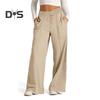Damen Freizeithose, elastische hohe Taille, verstellbarer Kordelzug, gerade Hose mit weitem Bein und Taschen, einfarbig, lange Hose