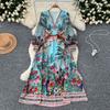 Frühling Herbst Frauen Print Chiffon V-Ausschnitt Puffärmel lange Maxi Urlaub Strandkleider