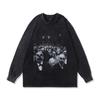 Streetwear Hässliches Gesicht Grafik Gewaschenes Schwarzes T-Shirt Baumwolle Unisex Übergröße Langarm T-Shirt