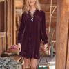 Einfarbige kurze Kleider für Damen, langärmeliges Patchwork-Kleid mit V-Ausschnitt und goldenem Samt