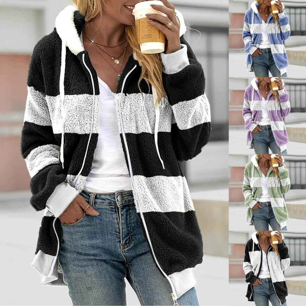 Lockere, große Damen-Plüschjacke mit mehrfarbigen Einsätzen und Kapuze und Reißverschluss