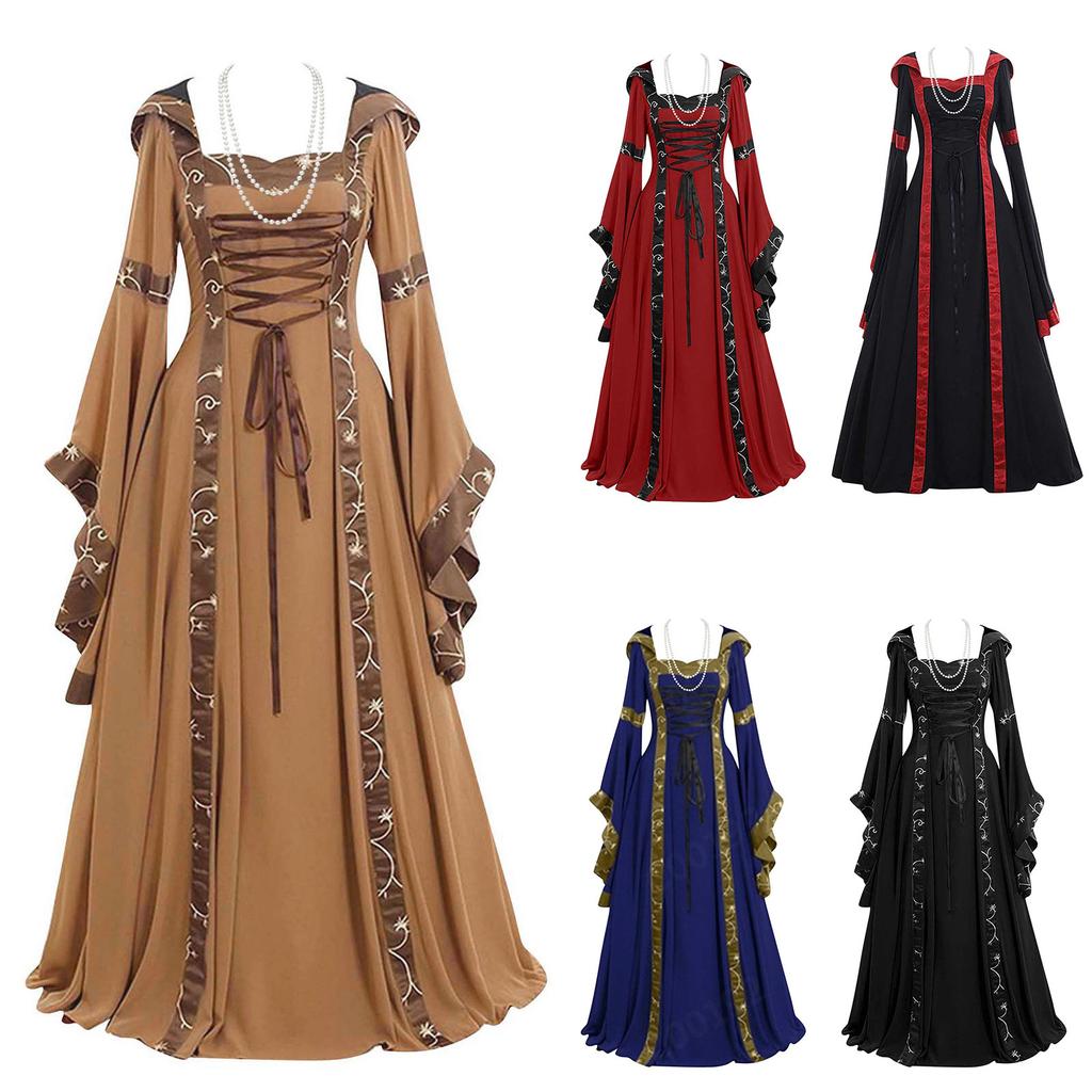 Damen Gothic Rüschen Glockenärmel Korsett Halloween Kostüm Übergröße Kleid Off Shoulder Grafikdruck Halskettenbesatz
