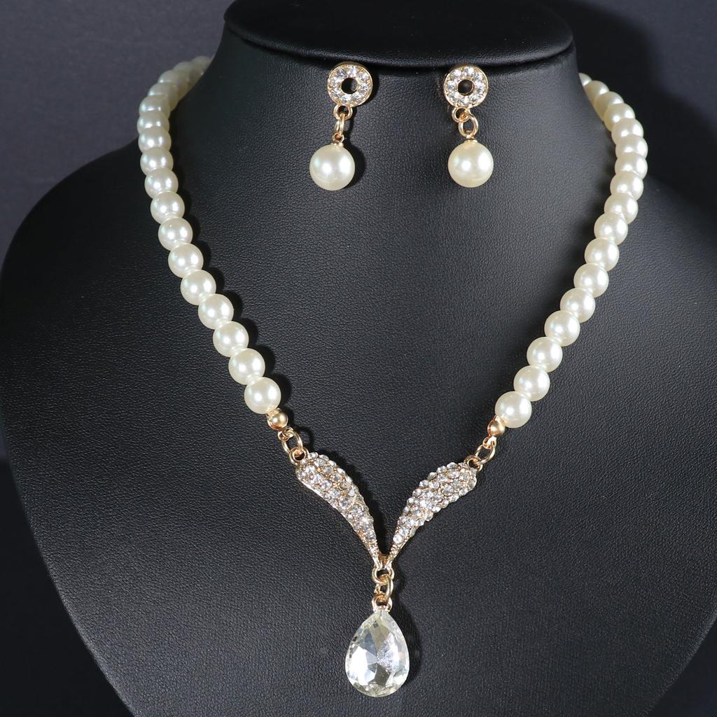Schmuckset Perlenohrringe Brautaccessoires Strass Halskette Mode Breites 2-teiliges Set Legierung