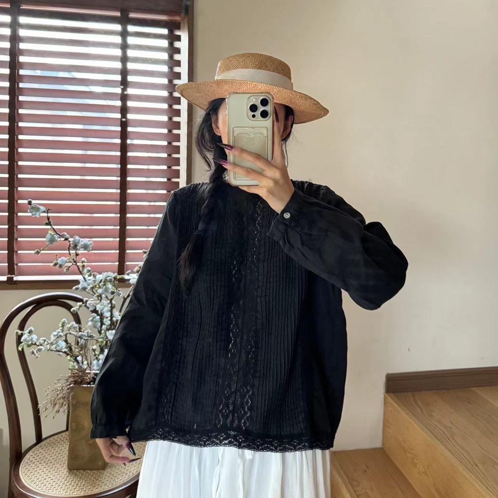 Johnature Spitzenshirt Leinen Schwarzes Shirt Langarm Damen Rundhals Lässig Einfache Blusen
