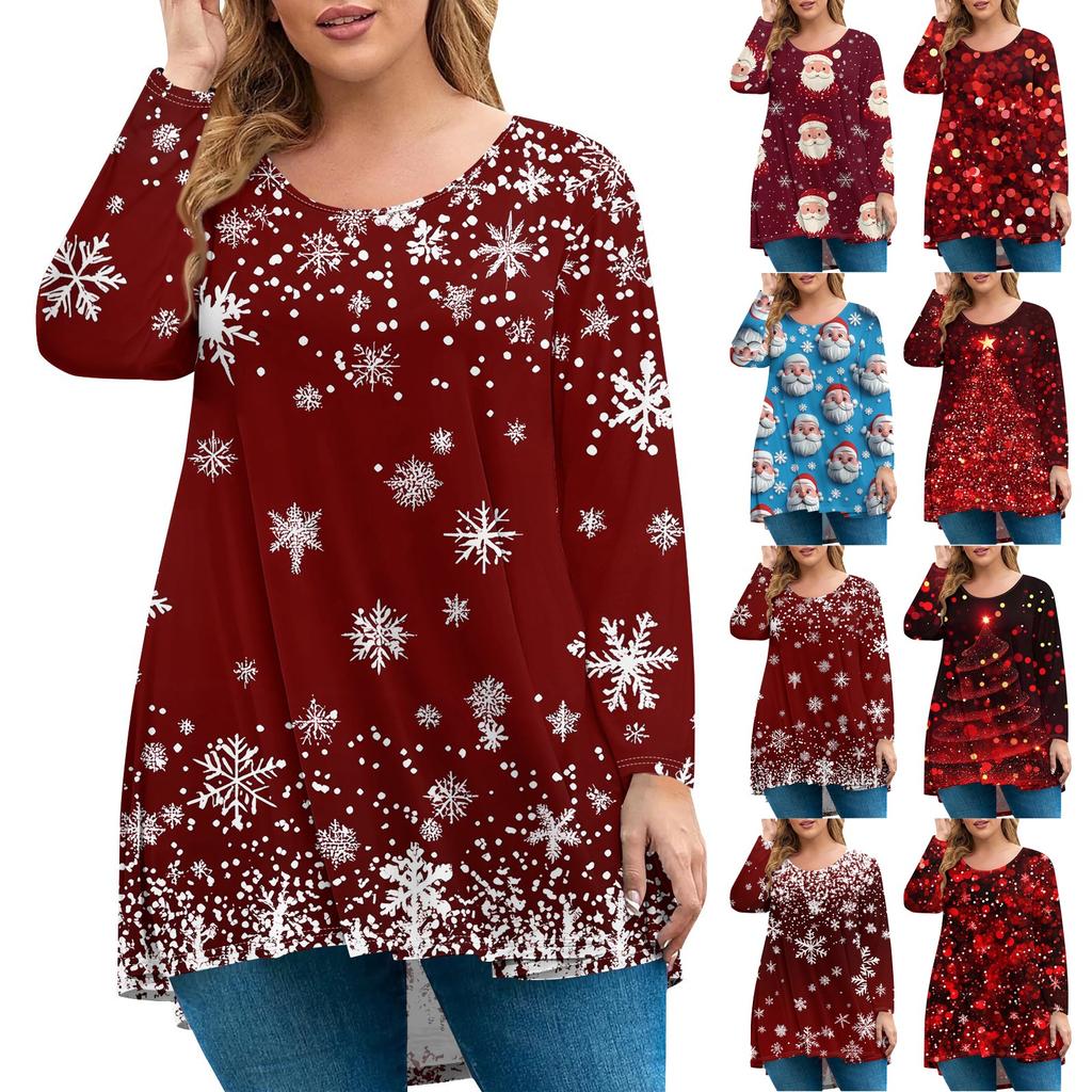Damenmode Große Größe Rundhals Langarm Lässig Weihnachtsdruck Lose Pullover Top