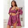 Leopardenmuster Seidensatin Damen Pyjama Set 3-teilig Ärmelloses BH & Seitenschlitz Shorts & Morgenmantel Weiblich Schlafbekleidung Homewear Nachtwäsche