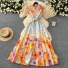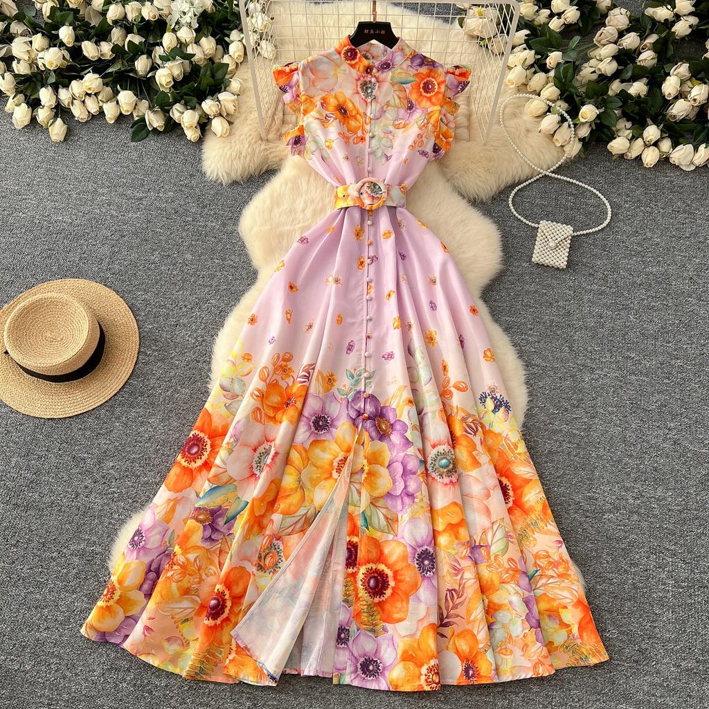 Kleid mit Blumendruck für Damen, Rüschen, fliegende Ärmel, kontrastierende einreihige Kleider, Taillenschnürkleider im Palaststil