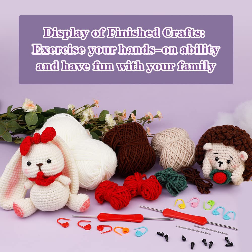 Fenrry Häkelsets mit Igel und Kaninchen, DIY-Anfänger, mit Garnknäueln, Maschenmarkierern, Nadeln, Anleitung, Zubehör