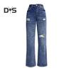 Damen-Jeans mit Taschen, hoher Taille, zerrissen, einfarbig, lange Hose, gerade Hose mit weitem Bein für den täglichen Weg zur Arbeit