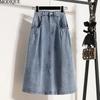 MODIQUE 2025 Neue Plus Size Sommer Damen Casual Vintage A-Linie High Waist Denim Langer Rock Damen Loose Solid Color Distressed Blue Rock