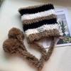 Niedliche Damen-Wintermütze mit Streifen, Buchstabenlogo und Plüsch-Ohrenklappen - Warmes Strickwoll-Design