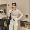 2025 Frühling Sommer V-Ausschnitt Sonnenschutz Dünn Lässig Locker Langarm T-Shirts Casual Locker Uni Perspektive Vorne und Hinten Doppel-Top für Damen T-Shirt