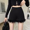 Schwarze Pelzshorts mit hoher Taille für Damen mit Stiefeln - A-Linien-Hotpants Herbst/Winter 2023