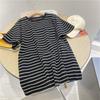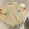 Damen Retro Chic HK Gestreiftes Kurzarm-T-Shirt mit Rückenaufschrift und lockerem Rundhalsausschnitt