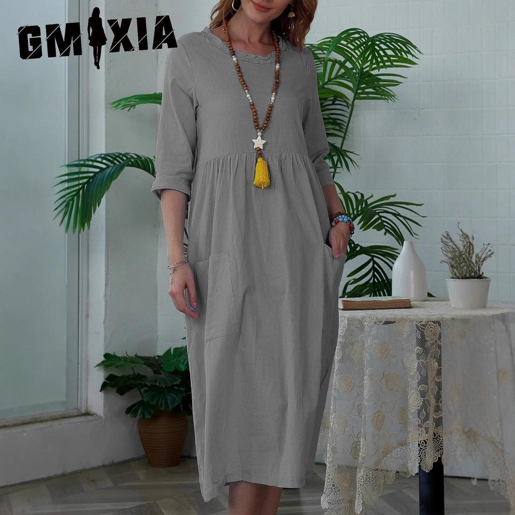 GMXIA Damen Midikleid Damen Solide 3/4 Ärmel O-Ausschnitt Mode