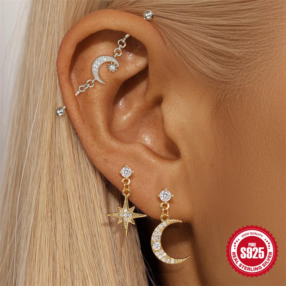 S925 Sterlingsilber Industrial Piercing Alltagskleidung Stern- und Mond-Element Kette Industrial Hantel Piercing