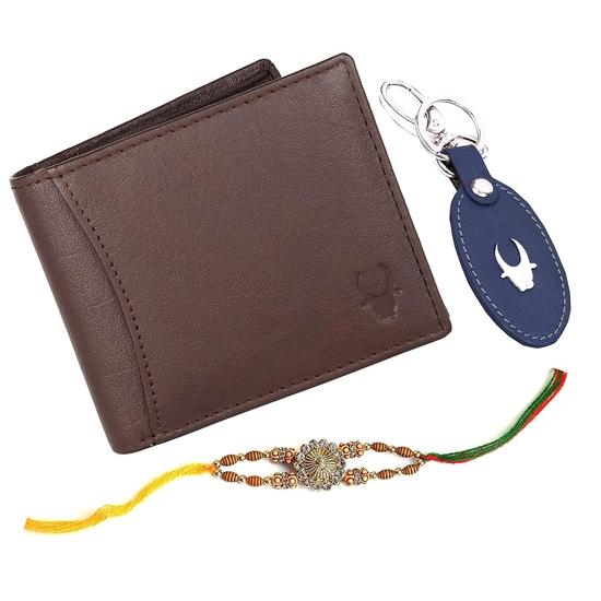 WildHorn Rakhi Gift Hamper for Brother - Classic Men's Combo/Gift Set of Leather Wallet, Keyring and Rakhi for Brother (Brown)