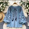 Y2k Goth Spice Girl Langarm T-Shirt Damen O-Ausschnitt Schnürung Laternenärmel Besticktes Shirt Weiblich Sommer Slim Tops