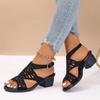 Große Sandalen Sommer Hohle Fischmaulschuhe Strass Ein-Wort-Schnalle Dicker Absatz Mittelhoher Absatz Römersandalen Mode Damen Atmungsaktive Schuhe