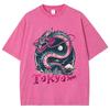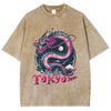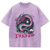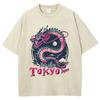 Japanische Cartoon Drache Tokio Buchstaben Print Damen T-Shirt Übergroß Gewaschene Baumwolle Halbarm Lockeres Design Street Top