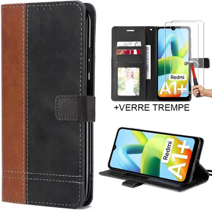 Coque + 2 Verres Trempés pour Redmi A1+/A2+ / A1 Plus/A2 Plus - Coque Effet Cuir Noir/Marron Bicolore