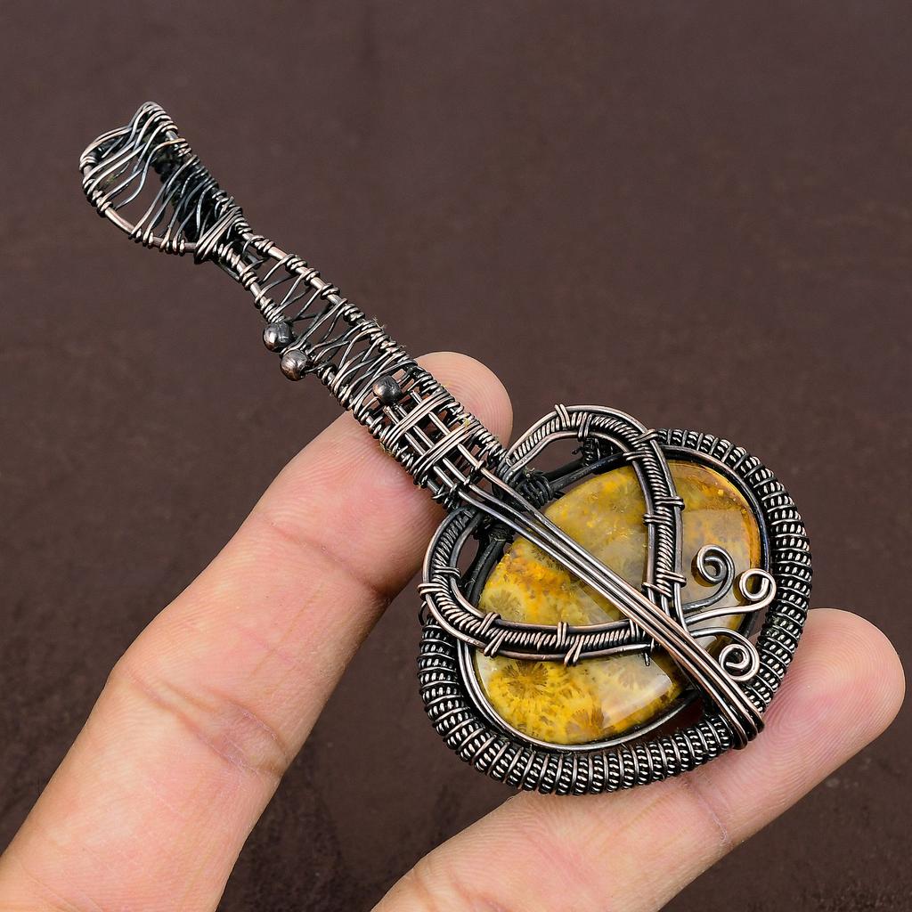 Fossile Koralle Handgefertigter Kupferdraht Wickel Gitarrenanhänger 3,1" K2n93