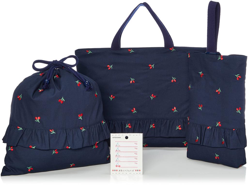 KIYOHARA Lesson Bag, Inner Shoes Bag, Gym Clothes Bag, Name Sticker, Embroidery, Cherry, Navy, KOF34-S3