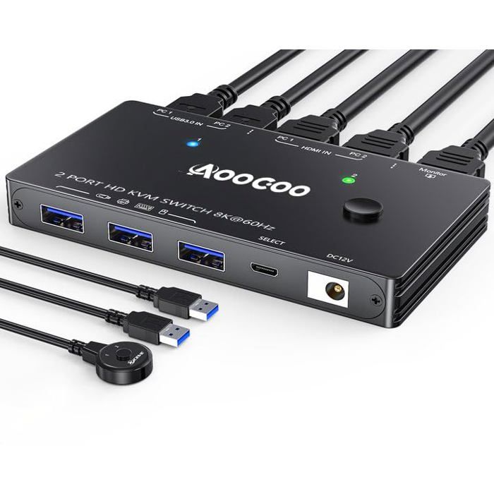 Commutateur KVM HDMI - AOOCOO - 2 PC 1 Moniteur - 8K à 60 Hz - USB 3.0 - Télécommande incluse