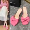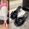 Sommer 2025 neue große Schleife Zehen offen Ein-Wort-Sandalen Damenmode eckige Spitze Schleife mittlerer Absatz