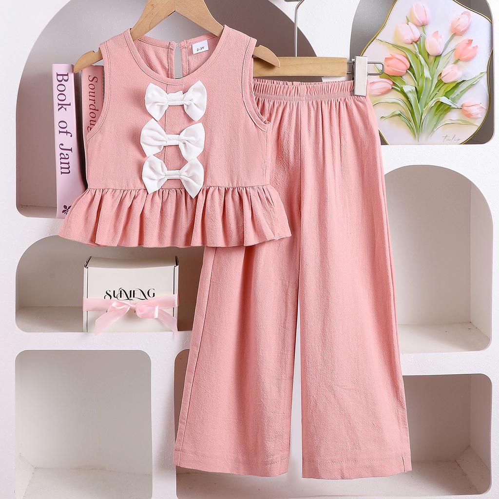 Sommer Kinder Süße Schleife Ärmelloses Top und Hose Zweiteiliges Mode-Set für Mädchen
